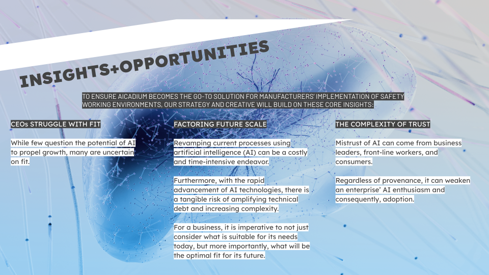 (Strategy Lead, Communications Framework)In 2022, amid widespread AI emergence anxiety and post-crypto winter skepticism, I developed strategic positioning for AIcadium Singapore to reframe industrial AI from existential threat to transparent, explainable partner.